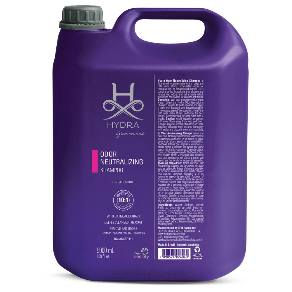 Hydra Groomers Odor Neutralizing Shampoo je špeciálny šampón vyvinutý špeciálne pre profesionálne použitie v starostlivosti o zvieratá, kombinujúci jedinečnú technológiu neutralizácie pachov s hlbokým čistením, starostlivosťou o pokožku a dlhotrvajúcou sviežosťou. Formula je obzvlášť účinná pre aktívne, vonkajšie zvieratá, ale dosahuje vynikajúce výsledky pre všetky plemená a typy srsti.